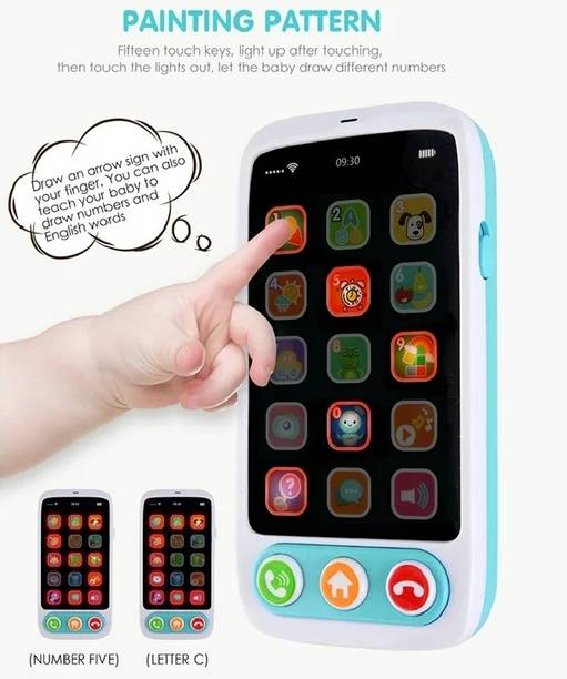 Fun Smart Phone Toy: Touch Smart Phone by Huanger With a full-screen design, touch screen kids phone 15 light-up apps, which depict super vivid icons such as animals, cars, robots, cameras, etc. The home button has 5 switch modes of learning numbers, cognition, games, drawing, and music. Catch baby’s eye, and keep babies entertained in role-playing games.